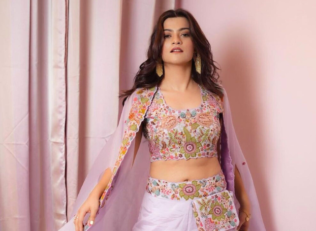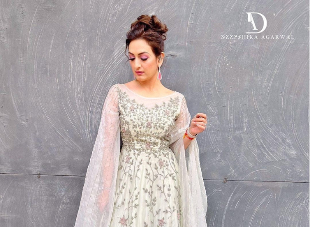 The ravishingly beautiful Akriti kakar steals hearts in mint-green floral trailing sleeves gown from LABEL DEEPSHIKA AGGARWAL