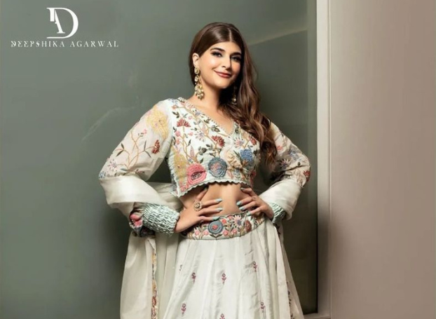 Niki Mehra radiates timeless elegance in a Floral Cutwork Draped Sari dress. Her grace intertwined with delicate blossoms, creates a mesmerizing aura of sophistication.