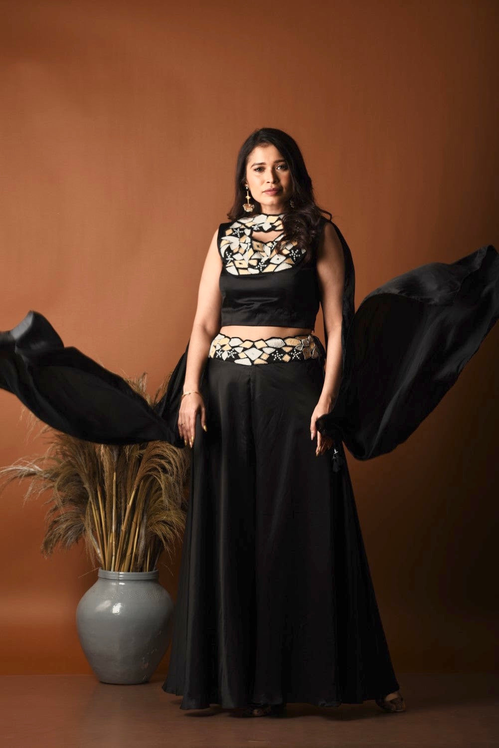 Featuring a black crop top with palazzo and patti dupatta with thread embroideris of geometric motifs with delicate highlights.