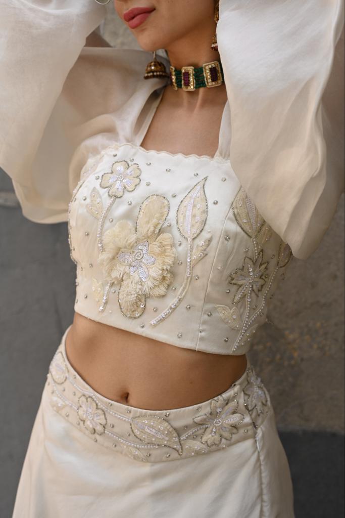 Featuring a crop top and skirt set with flounce sleeves and square neck. This piece is with monotone thread work and very delicate highlights.