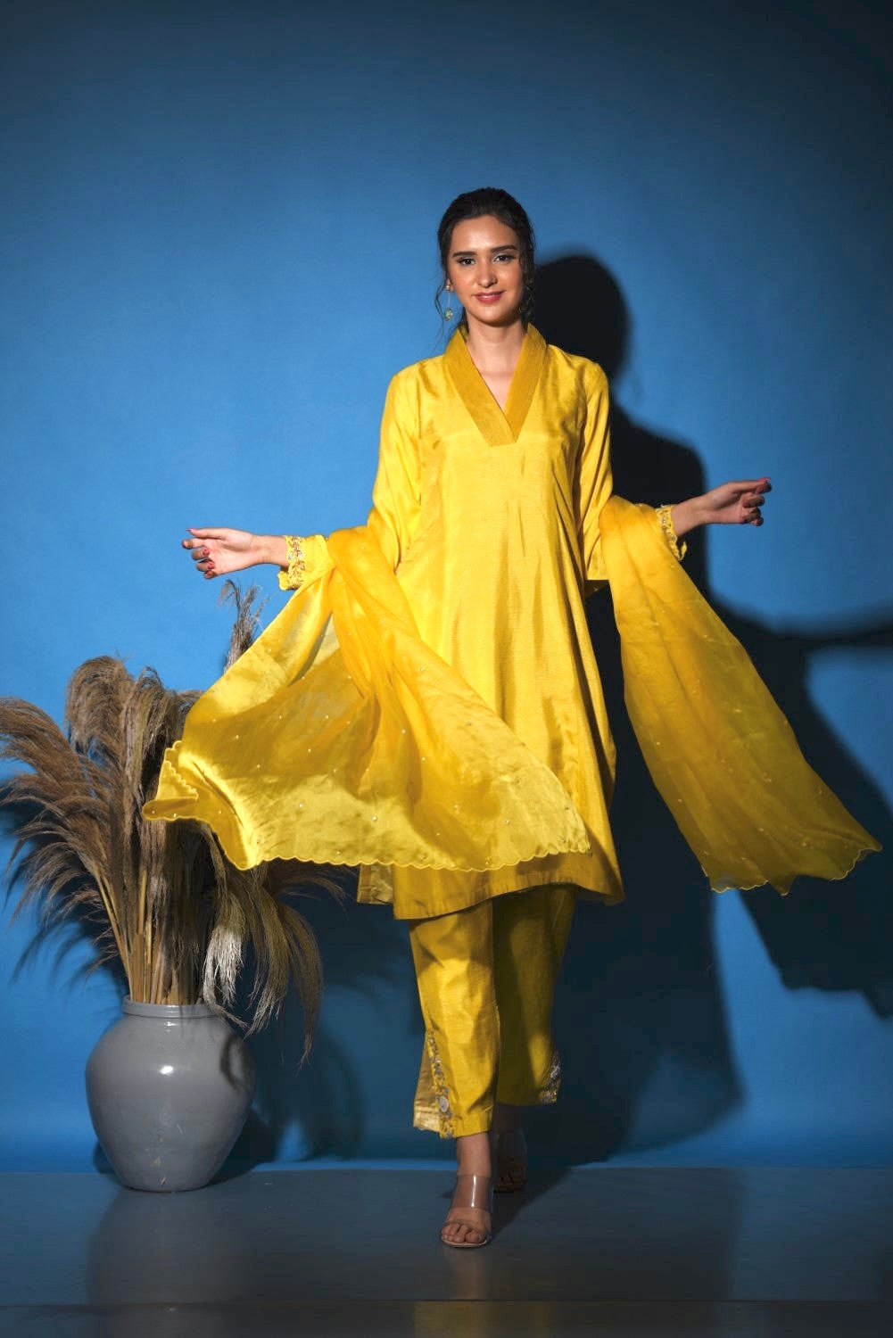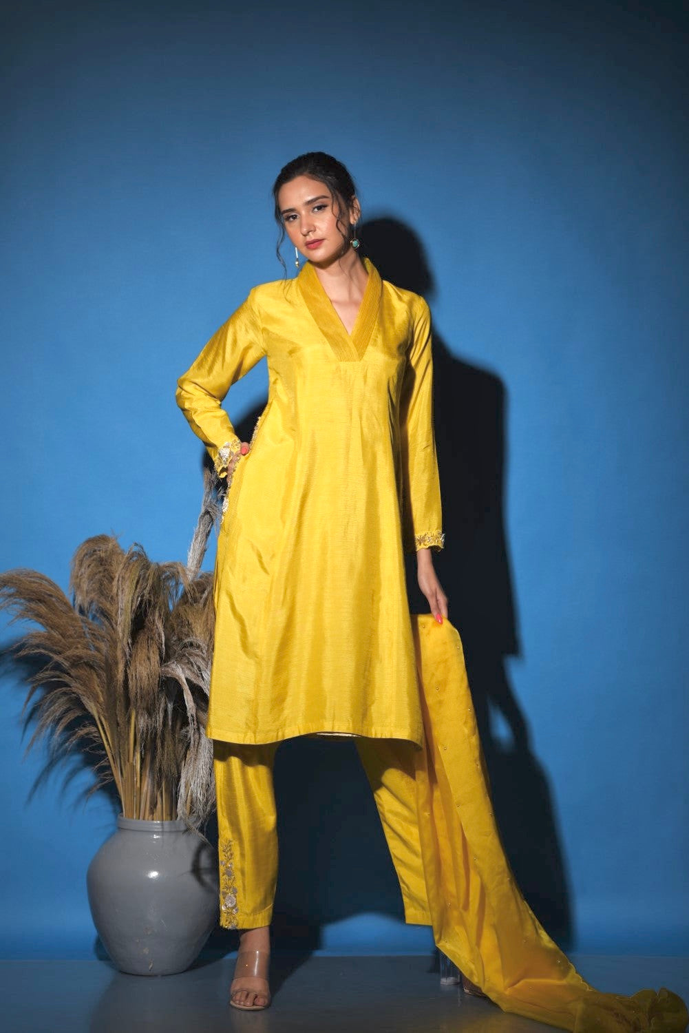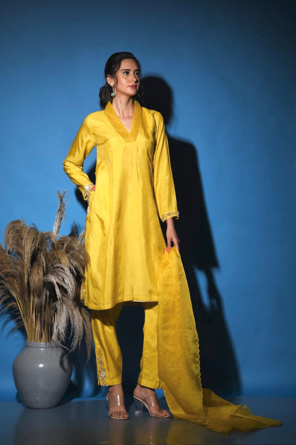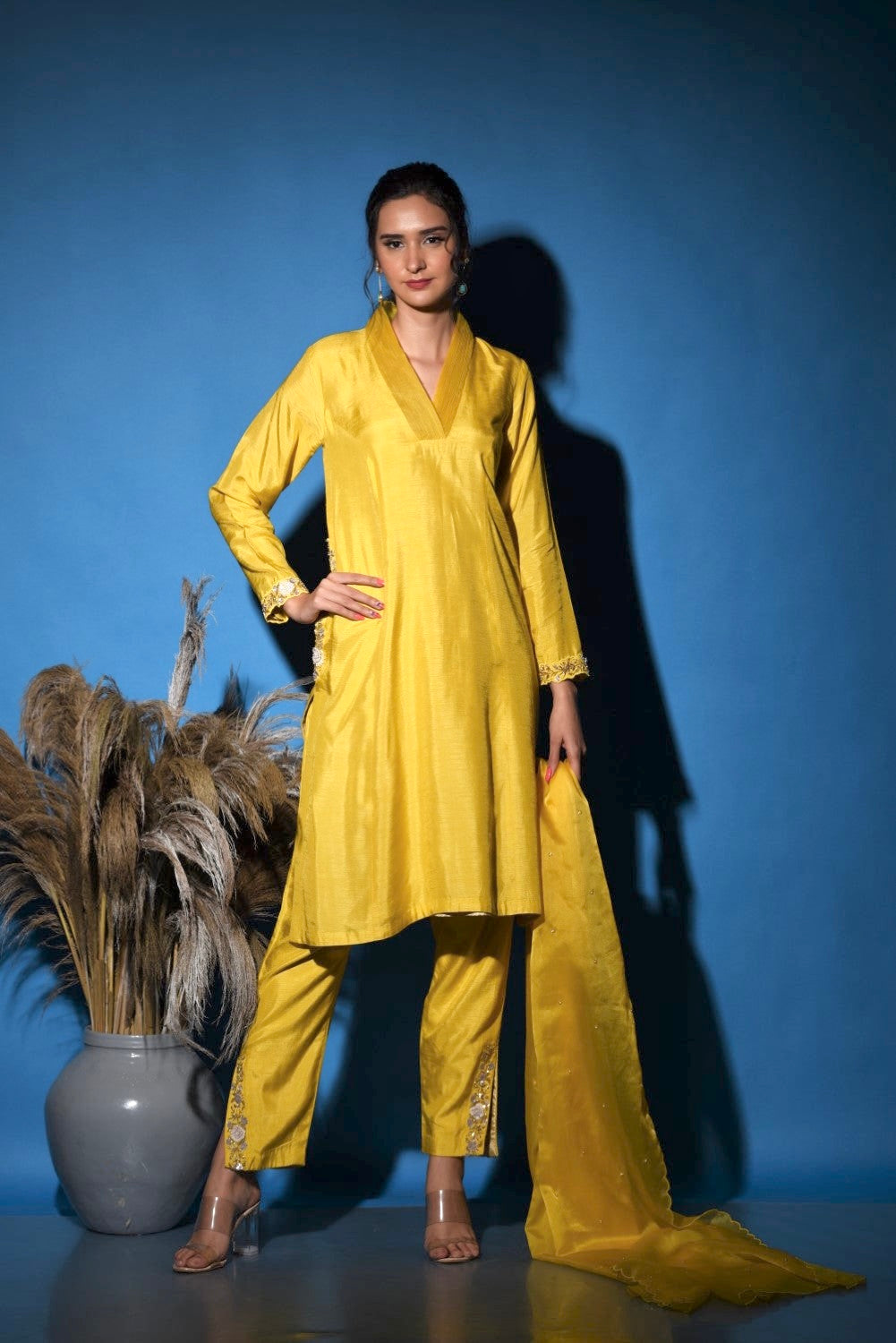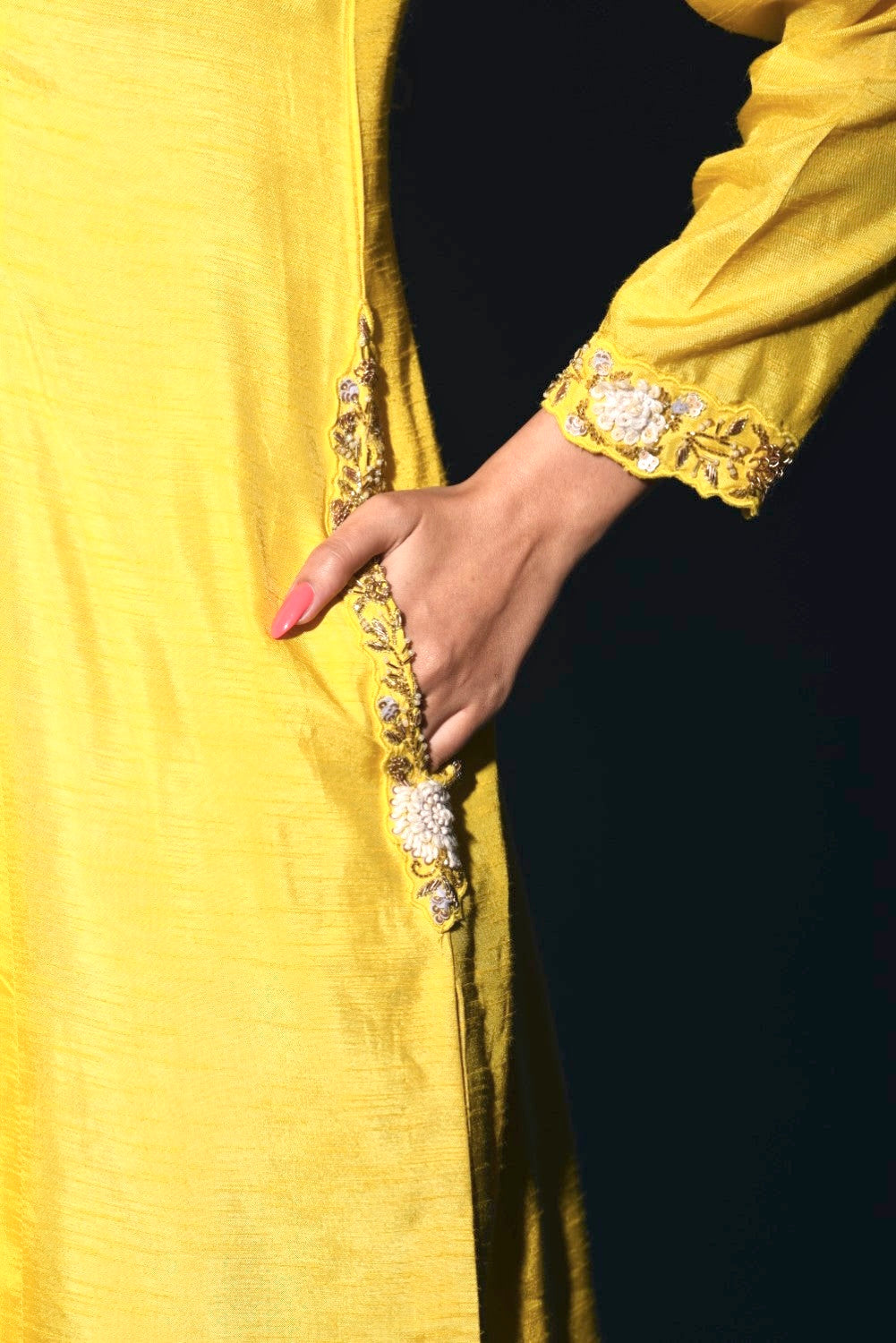 Featuring a mustard yellow kurti set with pintucks around v-neckline and intricate embellishments on cuffs, pockets and pant slits.