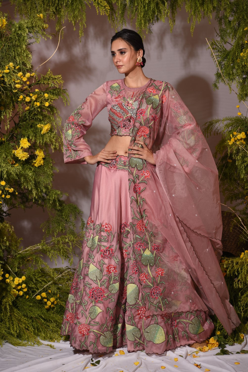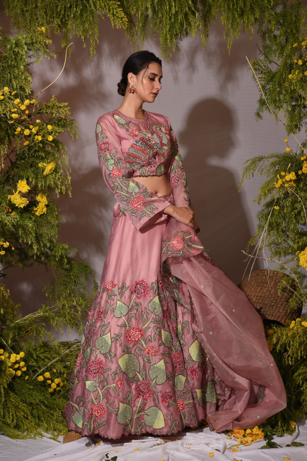 Featuring an onion pink embroidered lehenga set with full sleeves blouse and dupatta with ine side work.
