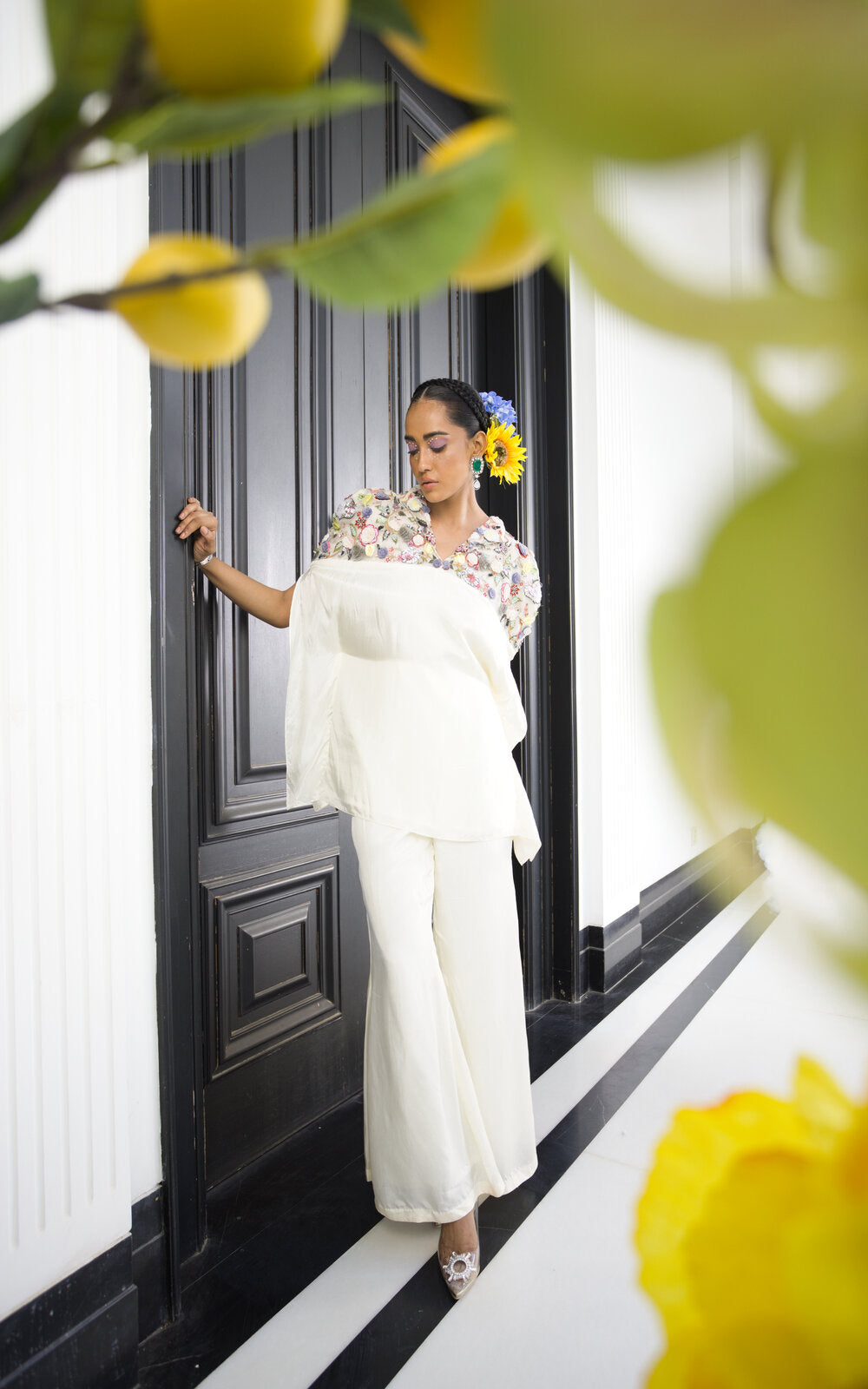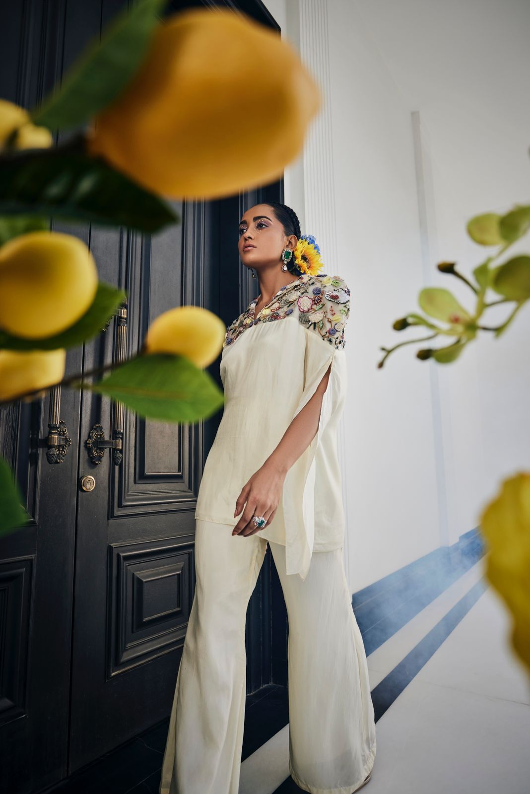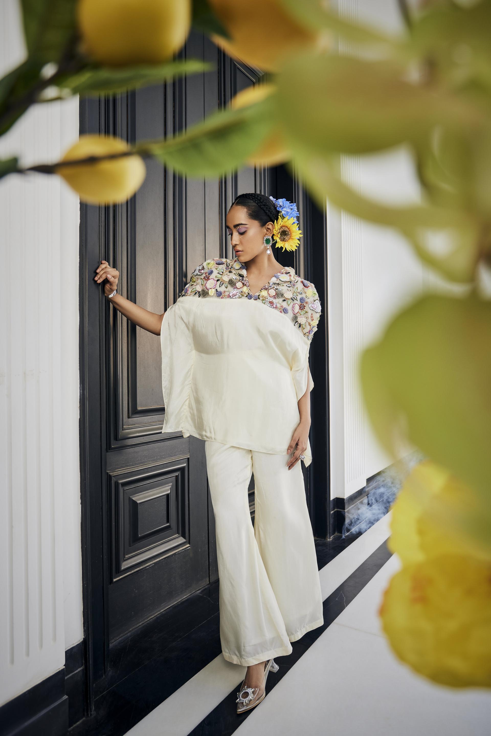 Very Classic Set in Flared Pants and collared Top with handembroidered Yoke work