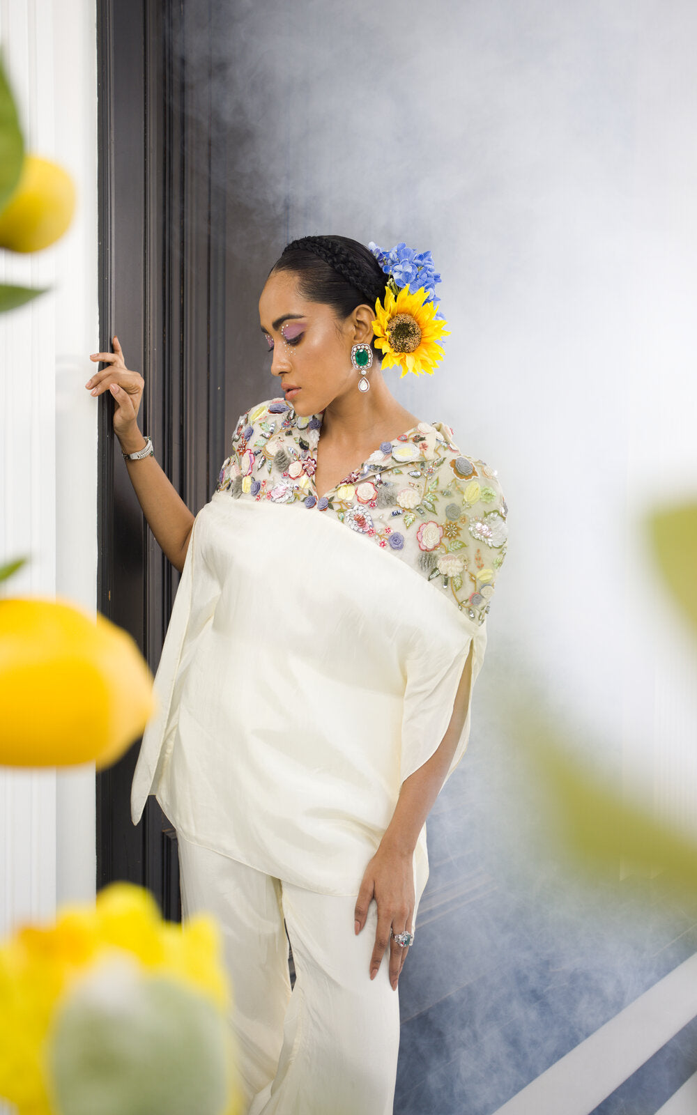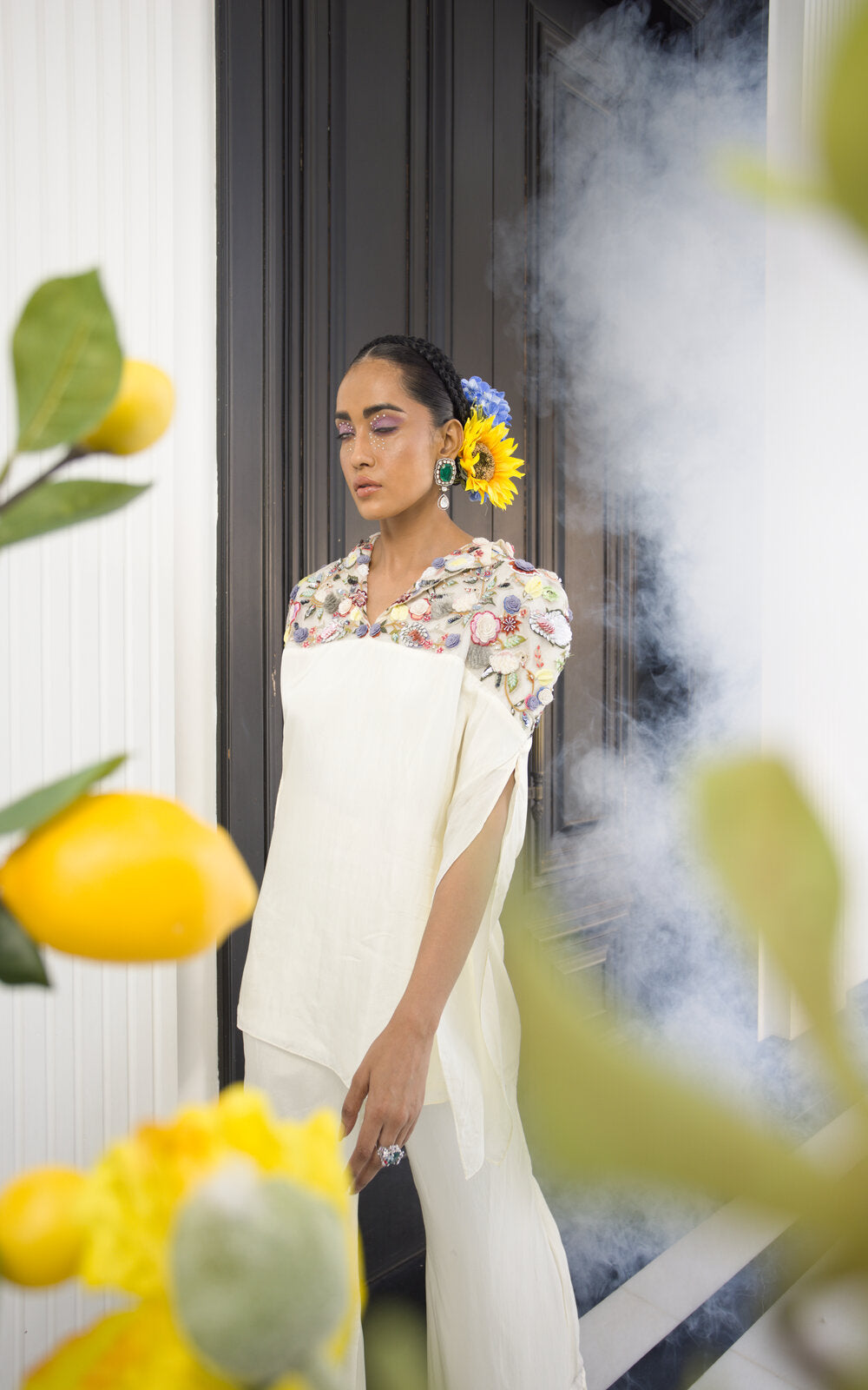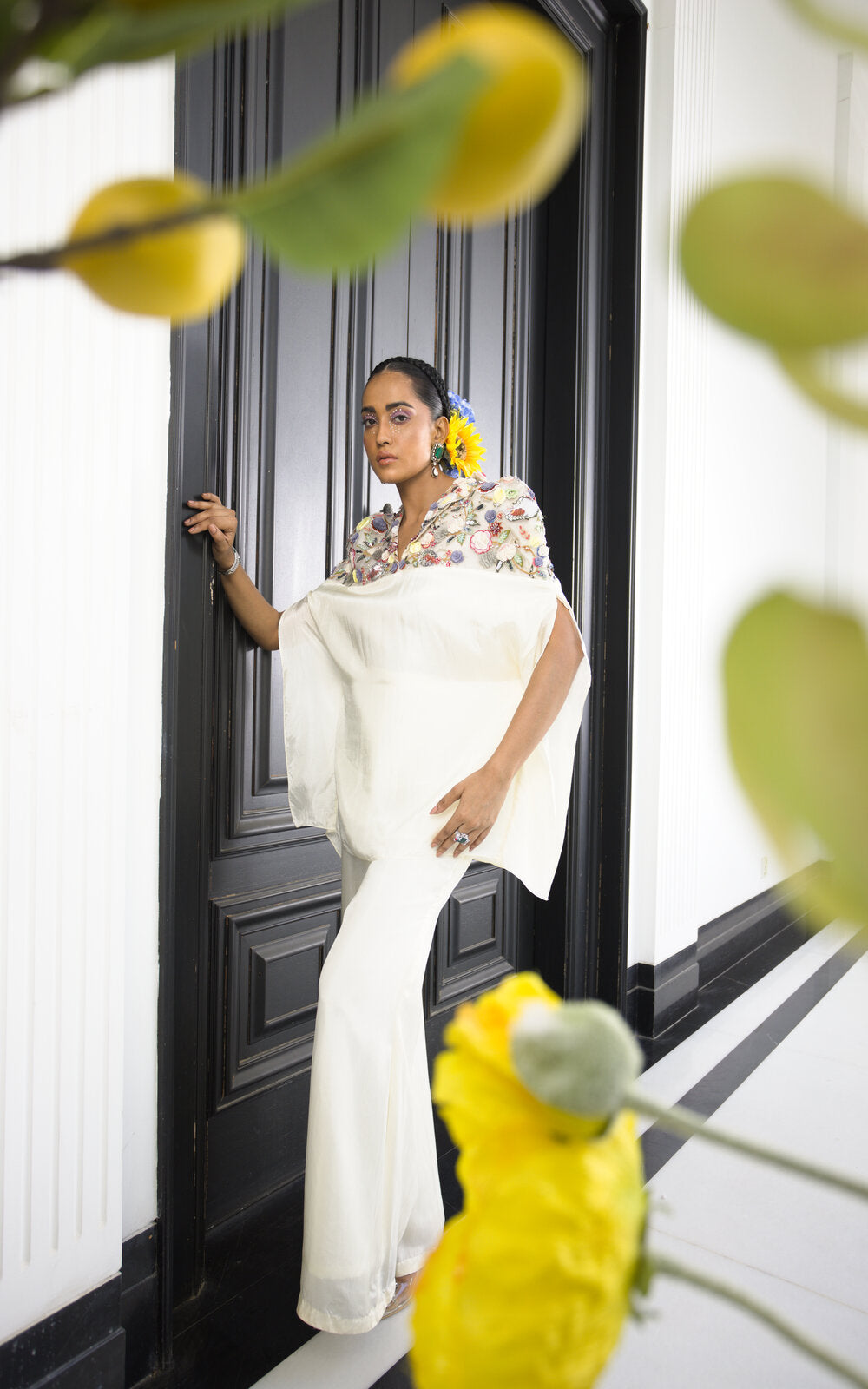 Very Classic Set in Flared Pants and collared Top with handembroidered Yoke work