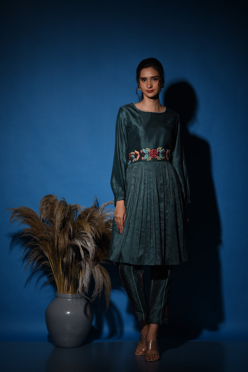 Featuring a teal green kurti set with gathers, floral embroidery on waist line and stripe embroidered pant.